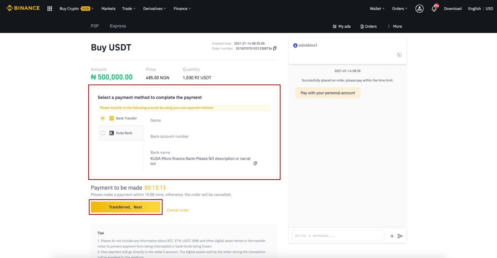 Masukkan kuantiti yang anda ingin beli, sahkan kaedah pembayaran penjual dan klik " Beli USDT ".