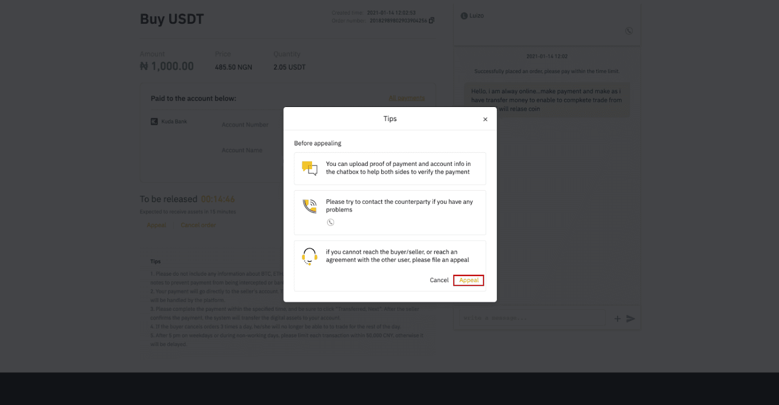 Jika anda tidak menerima mata wang kripto 15 minit selepas mengklik “Dipindahkan, seterusnya” , anda boleh menghubungi penjual dengan mengklik ikon “ Telefon ” atau “ Sembang ” di bahagian atas.