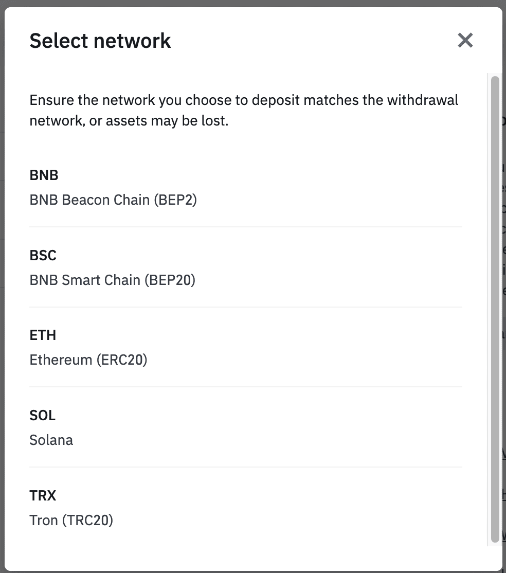 - JANGAN pilih pilihan bayaran yang paling murah. Pilih satu yang serasi dengan platform luaran. Sebagai contoh, anda hanya boleh menghantar token ERC20 ke alamat ERC20 yang lain dan anda hanya boleh menghantar token BSC ke alamat BSC yang lain. Jika anda memilih rangkaian deposit yang tidak serasi/berbeza, anda akan kehilangan dana anda.