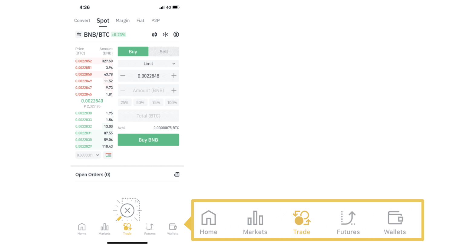 1. Log masuk ke Apl Binance, dan klik pada [Trade] untuk pergi ke halaman dagangan spot.
